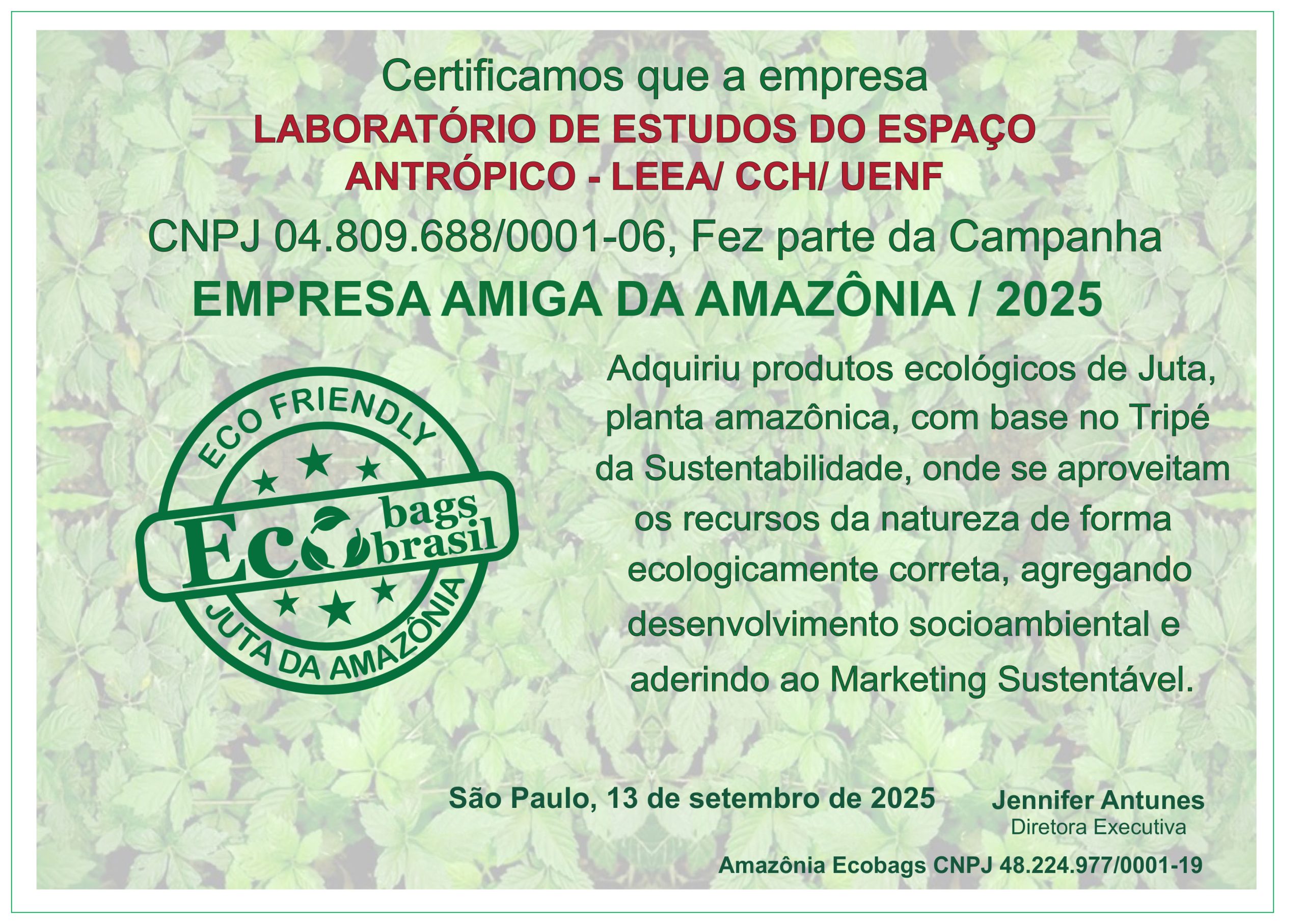 Laboratório de Estudos do Espaço Antrópico – LEEA/ CCH/ UENF, recebe certificado de empresa amiga da Amazônia